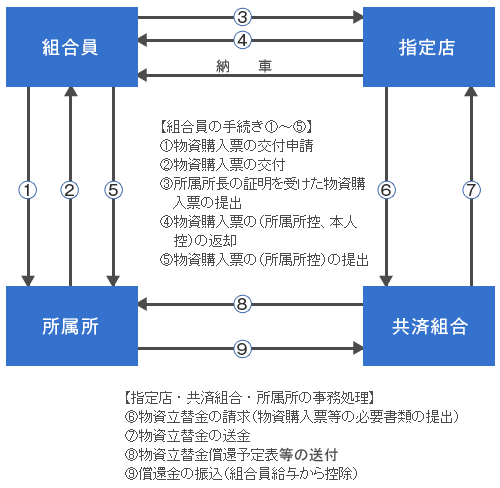 店頭販売により物資(自動車・オートバイ)を購入するときは、所属所長(市町村長、組合長)の証明を受けた「物資購入票」を指定店に提示し、直接、売買契約により物資(自動車・オートバイ)を購入してください(下図、自動車・オートバイ販売のしくみ参照)。
